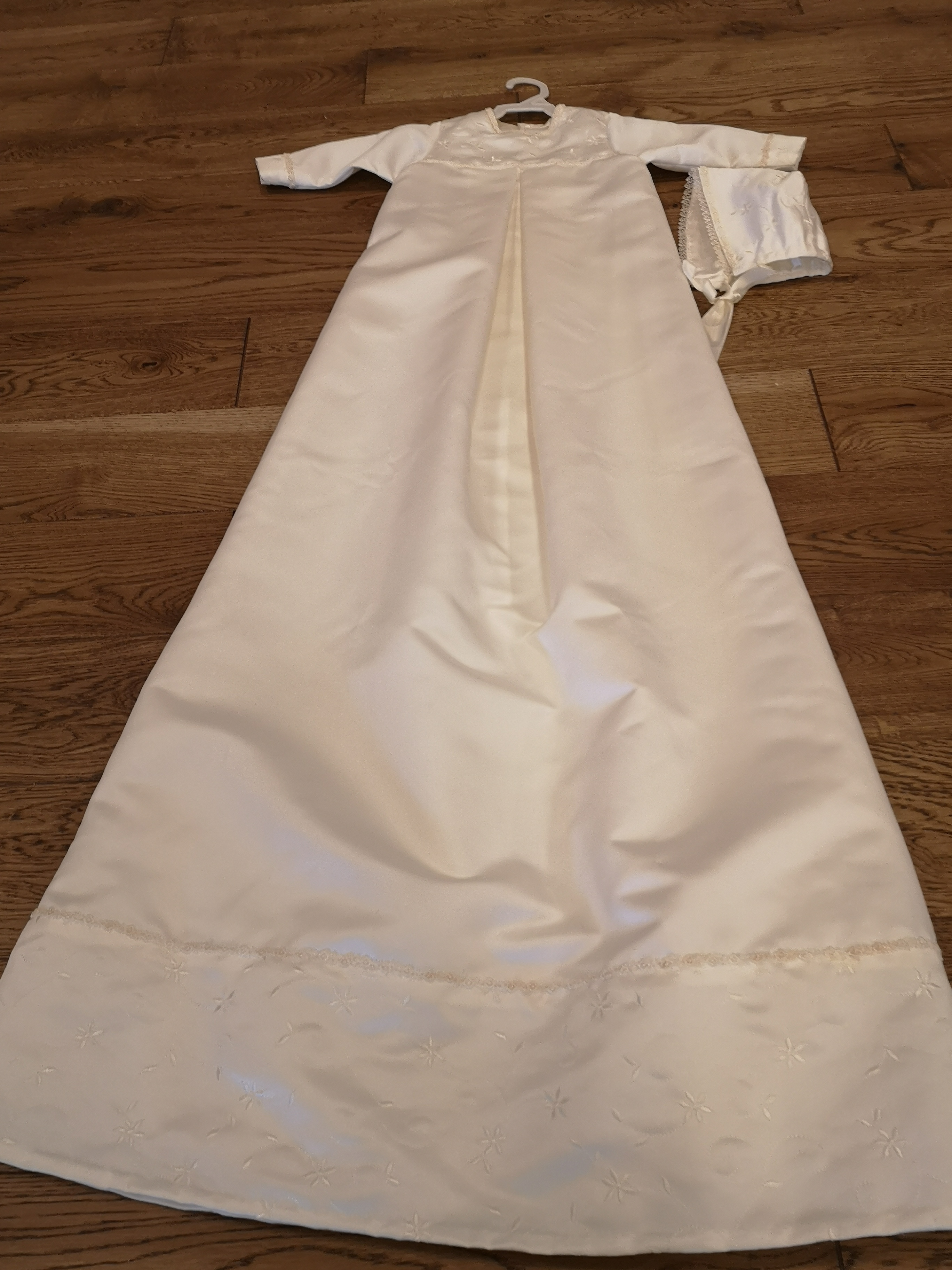 Me har fått ein dåpskjole i gåve til kyrkja. Denne vil me låna ut til dei som har behov for å låna ein dåpskjole.